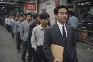 Lines outside of Chinese factories applying for work, 1992 (AI generated depiction)